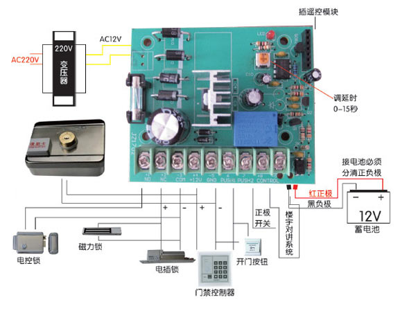 注意!接電控鎖時必須把延時調(diào)到0秒,以防止燒壞電控鎖線圈。