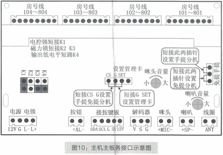 安裝施工調(diào)試時(shí),安裝工作人員可以根據(jù)現(xiàn)場(chǎng)環(huán)境的需要進(jìn)行一些調(diào)整,比如,通話聲音過(guò)大或過(guò)小,可以稍微調(diào)整“咪頭音量”的電位器(如圖10所示),一般不用調(diào)整。設(shè)備受施工場(chǎng)所、環(huán)境、線材質(zhì)量等因素的影響,主機(jī)或分機(jī)可能會(huì)出現(xiàn)嘯叫聲。如果出現(xiàn)此類(lèi)情況,安裝工作人可以通過(guò)調(diào)整“咪頭音量”和“喇叭音量”的電位器(如圖10所示)。電位器的調(diào)整方法:逆時(shí)針旋轉(zhuǎn)半圈至一圈慢慢調(diào)小,直至嘯叫聲消失,主機(jī)和分機(jī)都能聽(tīng)到最大最清晰最洪亮的對(duì)話即調(diào)試完畢。